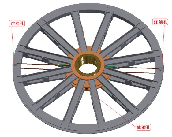 1.8 天(導向)輪軸瓦的維護 天(導向)輪生產(chǎn)完成后到到用戶安裝使用,一般會滯留一段時期,此時管路中及軸瓦內(nèi)在制造廠所加的潤滑脂很可能已經(jīng)變質(zhì)失效、風干、附著在油管內(nèi)壁和軸瓦油槽中,甚至形成堵塞,因此在使用前需要對潤滑管路及軸瓦進行清洗,保證潤滑油路的暢通。清洗時,將煤油等清洗劑通過輪緣上注油孔注入,游動輪輪轂中部設有2-M33×2出油口(此口也可以做注油口使用),清洗完成后用螺塞堵住。