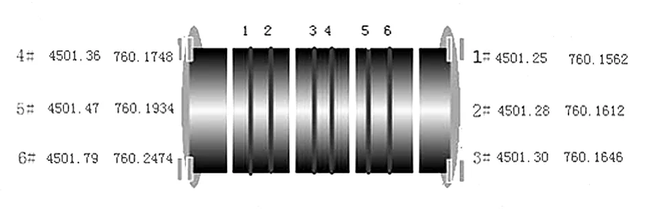 繩槽誤差在線檢測報警裝置的功能:①旋轉編碼器測量卷筒的周長,將繩槽直徑放大 3.14 倍,如果運行 50 圈,相當于放大了 157 倍,準確性高,存儲系統對測距數值進行存儲;②PLC 記數運算裝置具有比較功能,繩槽誤差超過要求時,顯示器上會出現報警畫面,及時提醒提升機管理員進行調繩,避免出現提升事故;③其余數據信息通過顯示器進行動態顯示,可以直觀了解每根鋼絲繩的運行速度,每個繩槽的直徑誤差,易于發現繩槽磨損規律,提高檢查及檢修的工作效率。繩槽誤差監控應用如圖1 所示,繩槽誤差監控軟件報警界面如圖2 所示,提升機卷筒直徑計算界面如圖3 所示。